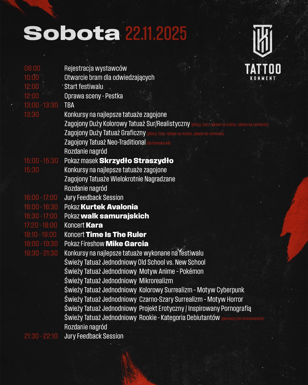 Co więcej, na scenie pojawi się również Mike Garcia, performer znany z fireshow, teatralnych kostiumów i rockowej energii. Jego show od lat przyciąga tłumy na największych festiwalach tatuażu w Europie.