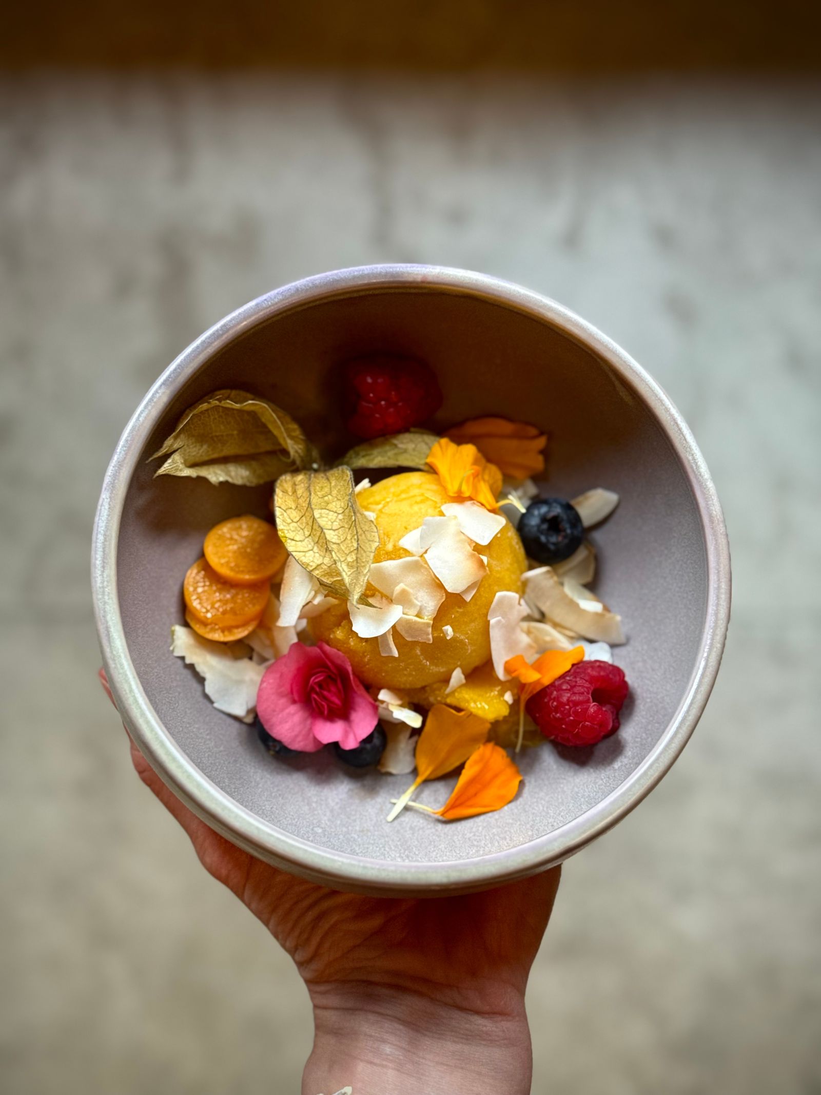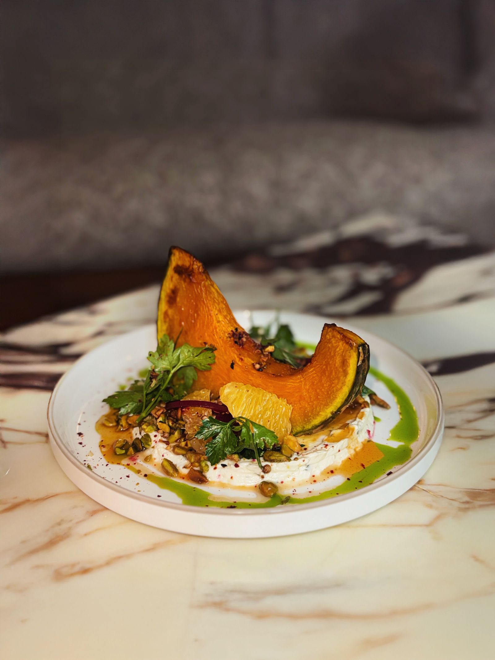 Na deser bursztynowy kwiat: sablé z musem karmelowo-pomarańczowym, dynią i korzenną nutą kolendry.