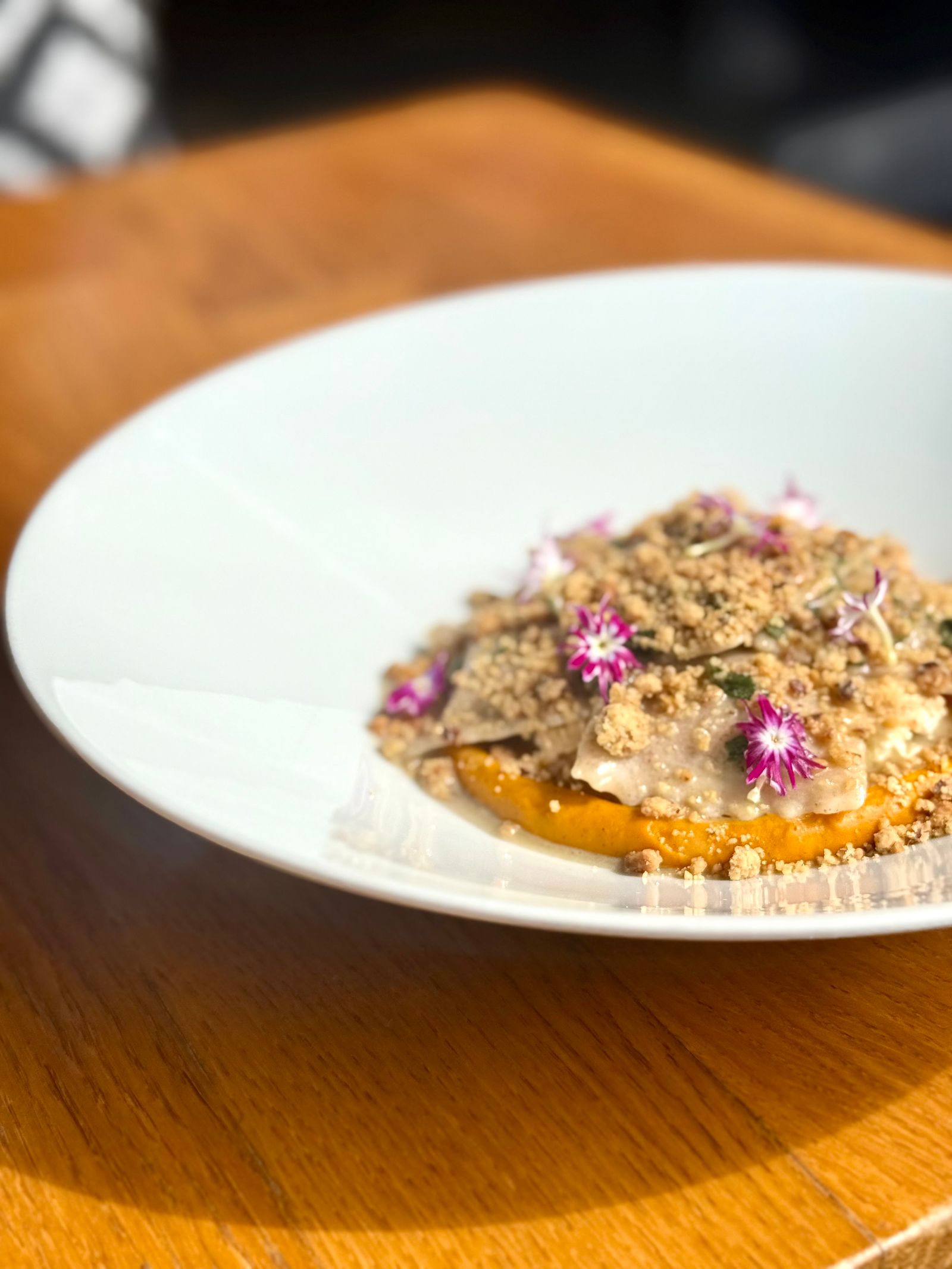 Menu B to tatar z dyni hokkaido z marynowanym serem feta i dressingiem musztardowo-miodowym, ręcznie robione ravioli z borowikami i ricottą w sosie z palonego masła i szałwii oraz panna cotta z niebieską matchą, kokosowym ganache i marakują.