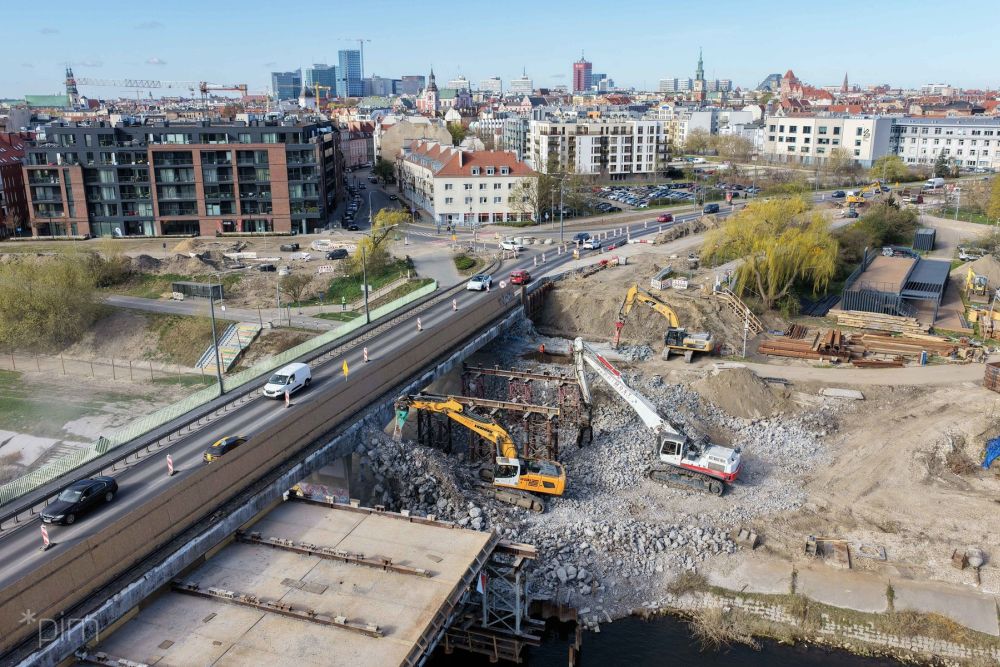 Równolegle trwa rozbiórka północnej nitki mostu. Prace są już bardzo zaawansowane. Większość przęseł została zdemontowana, a wykonawca skupia się teraz na usuwaniu przyczółków i podpór.